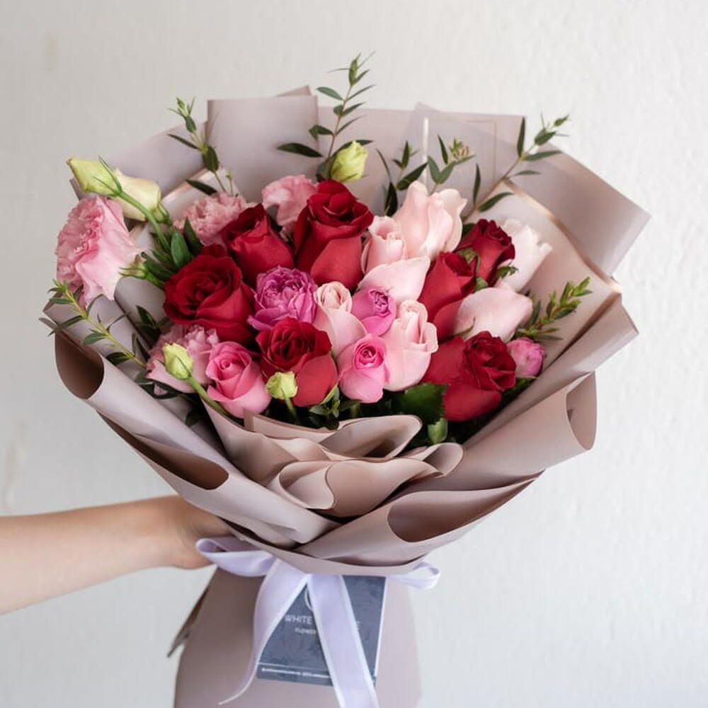 Satin ribbon - 1 pcs Lisianthus - 4 pcs Leaves - 4 pcs wrapping sheets - 7 pcs mixed roses - 16 pcs