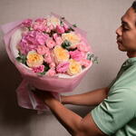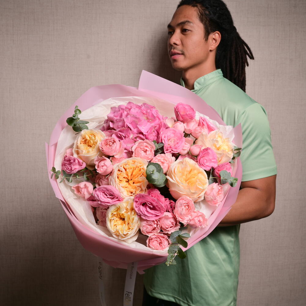 This arrangement features hydrangea, Julieta roses, eustoma, expression roses, and eucalyptus, creating a soft and elegant look perfect for any special occasion