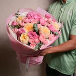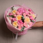 Ribbon - 1 pcs Eustoma - 5 pcs Eucalyptus - 4 pcs Hydrangea - 1 pcs wrapping paper - 5 pcs julieta - 5 pcs expression - 5 pcs