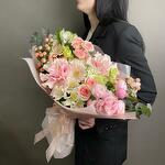 Satin ribbon - 1 pcs Eustoma - 1 pcs Eucalyptus - 2 pcs Alstroemeria - 2 pcs Gerbera - 2 pcs Pistachio - 2 pcs carnation - 2 pcs hypericum - 3 pcs designer packaging - 1 pcs bush rose - 4 pcs ecuadoran rose - 2 pcs