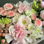 A sweet mix of soft white and shades of pink in a hand-tied bouquet that is sure to bring a smile to the face of any recipient. Pink roses beatifully combined with alstroemerias, herberas. The perfect choice to congratulate for birthdays or anniversaries.