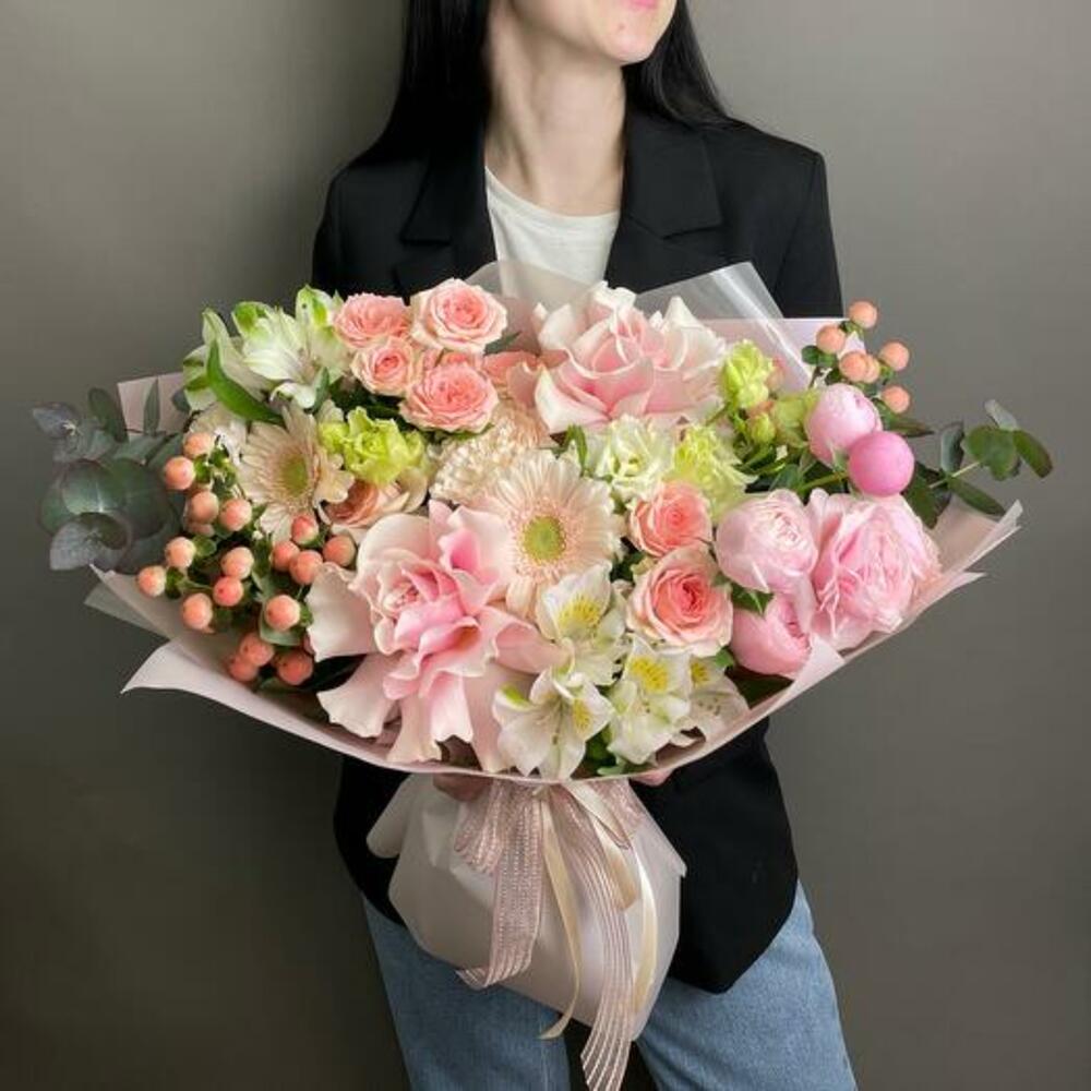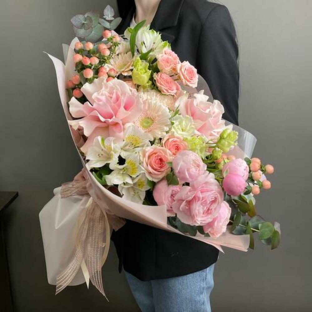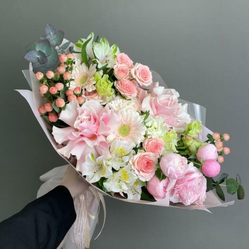 Satin ribbon - 1 pcs Eustoma - 1 pcs Eucalyptus - 2 pcs Alstroemeria - 2 pcs Gerbera - 2 pcs Pistachio - 2 pcs carnation - 2 pcs hypericum - 3 pcs designer packaging - 1 pcs bush rose - 4 pcs ecuadoran rose - 2 pcs