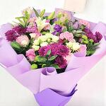 This vibrant bouquet bursts with joyful charm and rich hues of violet, pink, and creamy white. It features a stunning medley of chrysanthemums, roses, lilies, and alstroemerias, evoking elegance and celebration in every bloom. To prolong its beauty, place the bouquet in fresh water upon receipt, change the water every two days, and trim stems at a diagonal angle. Avoid direct sunlight and extreme temperatures to maintain freshness and vibrant colors. Ideal for those special moments like birthdays, anniversaries, or any heartfelt occasion, this flower bouquet transcends the ordinary and becomes a tangible manifestation of love. Send it as a birthday gift, express anniversary wishes, convey get well soon sentiments, or simply wish a loving moment to someone dear.