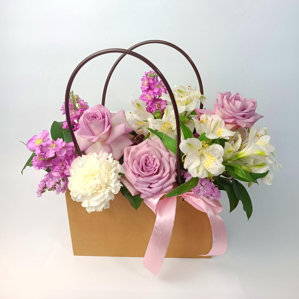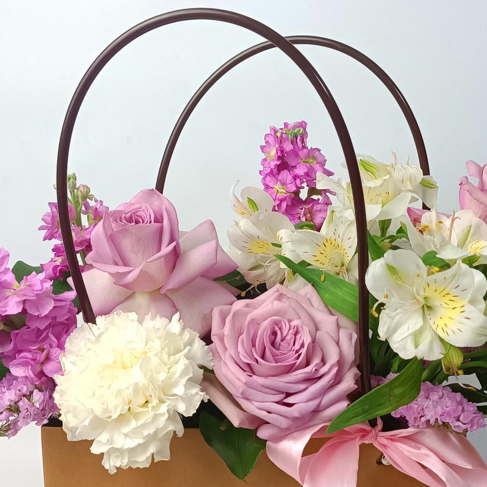 Chic, sweet, and effortlessly gift-ready—this elegant Pink flowers box / Pink flowers basket style arrangement comes in a beautiful handled flower bag, perfect for easy carrying and instant “wow”. It features romantic lavender/purple roses (a soft Rose bouquet feel), delicate white alstroemeria (Peruvian lilies), a fluffy white carnation, and pretty pink filler blooms like stock with fresh greenery (some fillers may vary slightly by season while keeping the same look and feel). Finished with a satin ribbon, it’s a premium Fresh bouquet / Fresh flowers bouquet crafted with premium quality and premium quality flowers. Perfect as a modern Birthday Bouquet alternative and a lovely choice for Birthday gifts, Birthday flowers, and Flowers for birthday. It also works beautifully as a Congratulations bouquet with elegant Congratulations flowers, and as a sweet Romantic bouquet filled with love and romance flowers—great for best flowers for anniversary too. A stylish cool bouquet concept, always trending flowers and a truly unique flowers bouquet—ideal for anyone searching for the best bouquet in dubai.