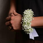 The Flower Bracelet is a charming and delicate accessory crafted with 5 sprigs of fresh gypsophila (babys breath). Perfect for weddings, parties, or any special event, this floral bracelet adds a soft and elegant touch to any outfit. It is elegantly tied with a satin ribbon, making it a beautiful, timeless piece.