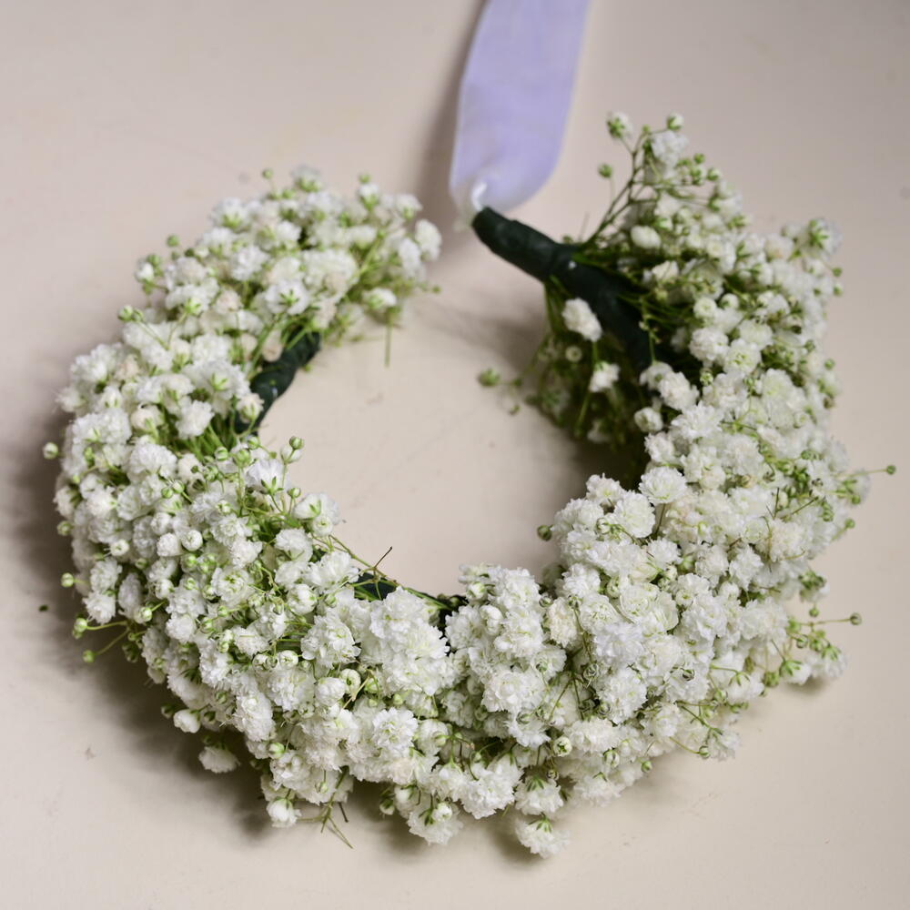 The Flower Bracelet is a charming and delicate accessory crafted with 5 sprigs of fresh gypsophila (babys breath). Perfect for weddings, parties, or any special event, this floral bracelet adds a soft and elegant touch to any outfit. It is elegantly tied with a satin ribbon, making it a beautiful, timeless piece.