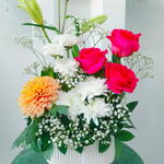 Presenting our florists special, a poised mix of 6 white chrysanthemums, 3 fuschia roses, and a single regal white lily. The bouquet is further enhanced with 5 sprigs of gypsophila and a single, luxurious dahlia. This delicate array of flowers exudes an elegant charm, offering a timeless appeal with its clean, crisp whites contrasted by the bold hues of fuschia roses. Gypsophila serves as a delicate understated compliment to the bouquet, while the dahlia adds a touch of grandeur. Perfect for any occasion or celebration, this radiant assortment is sure to leave a lasting impression. Whether youre looking to express your love, send condolences, or simply brighten someones day, this stunning bouquet is your perfect choice.