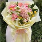 Composition: Hydrangea - 1, Dianthus - 5, Freesia - 5, Rose White Ohara - 3, Spray Rose Julieta peach - 2, Eucalyptus - 1, Craspedia - 6, Skimmia - 1, Rose Pink Ohara - 2, Rose sprey Madame Bombastic - 2, wrapping - 7, ribbon - 1 Sizes: WIDTH - 50CM; HEIGHT - 60CM; LENGTH - 60CM; (including packaging) Size: 50 x 60 x 60 cm