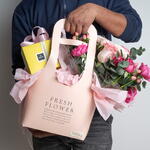 Mixed flowers and Patchi chocolates arranged in a paper bag