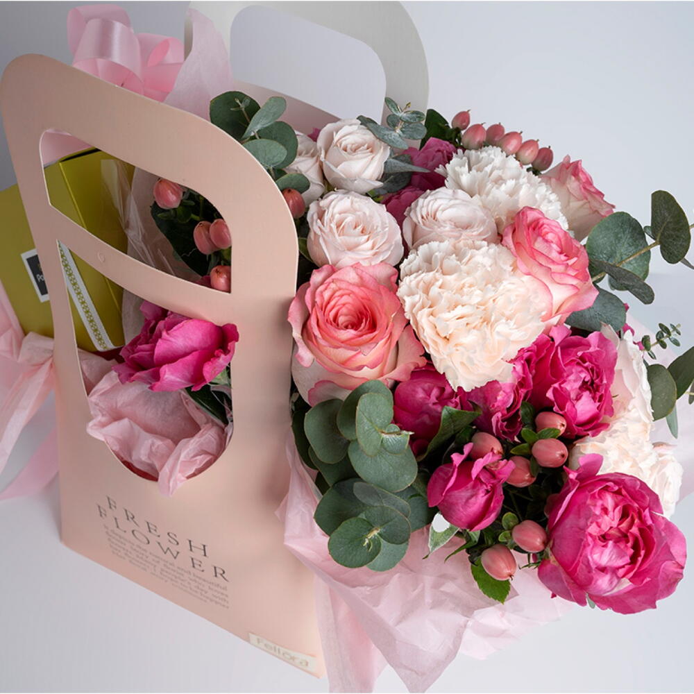 Mixed flowers and Patchi chocolates arranged in a paper bag