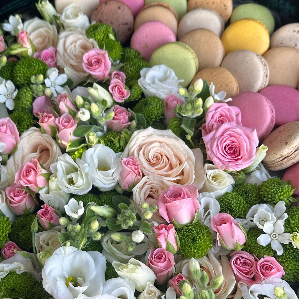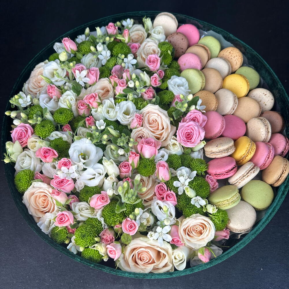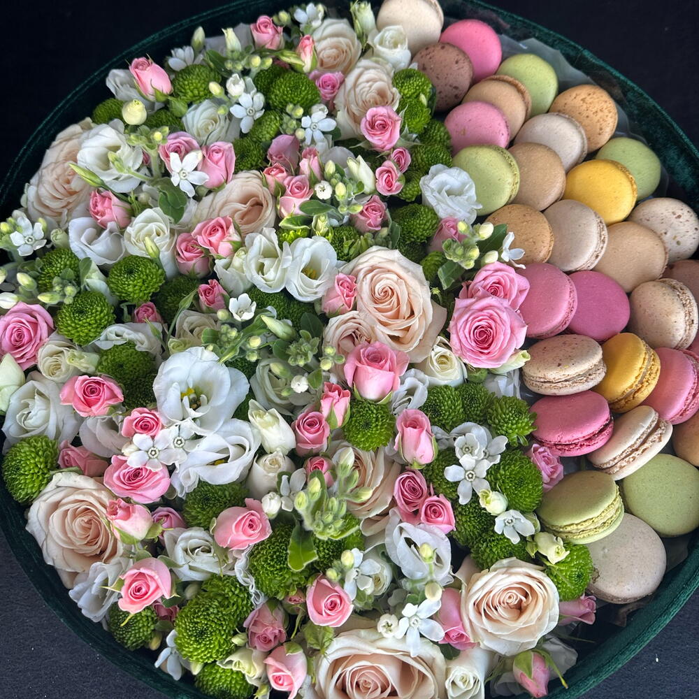 rose white - 10 pcs rose peach - 10 pcs lucianthus white - 10 pcs baby rose pink - 10 pcs chrysanthemum green - 10 pcs white oxypetalum - 10 pcs big 50 cm velvet box - 10 pcs laduree macaroons - 30 pcs