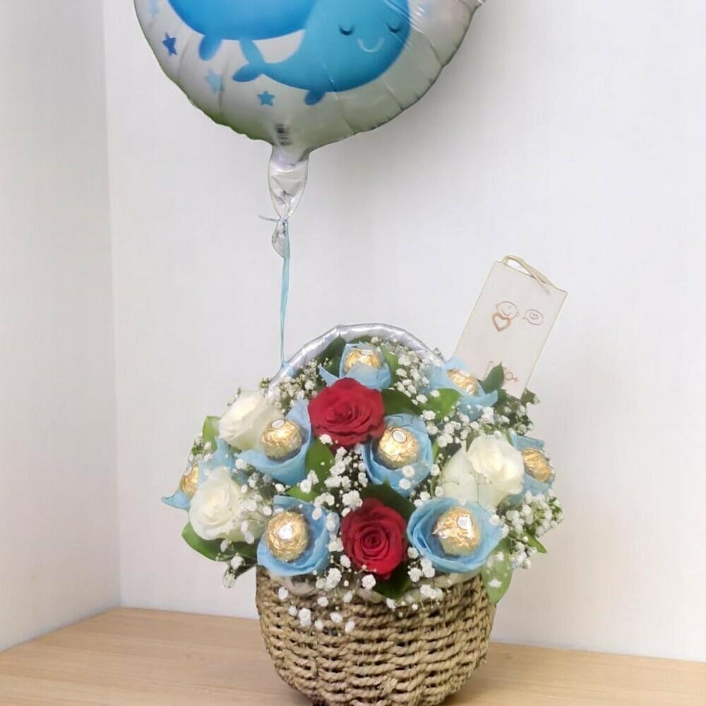 Ferrero rocher - 10 pcs White rose - 7 pcs reed rose - 5 pcs birthday balloon - 1 pcs
