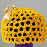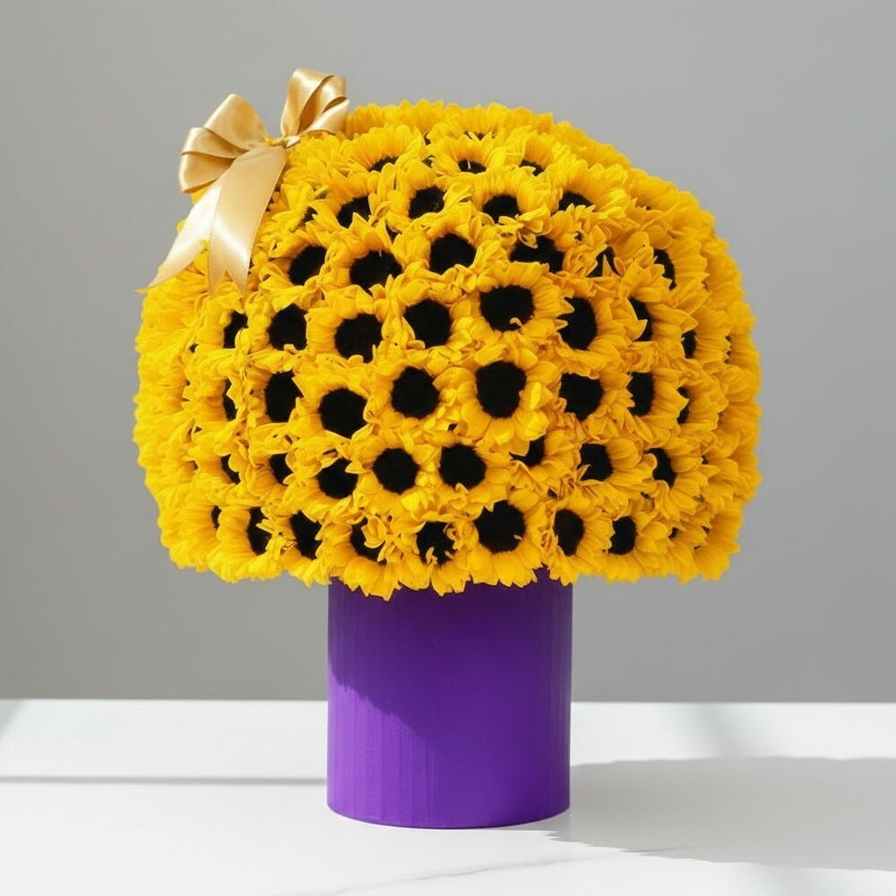 This vibrant sunflower arrangement is a true celebration of joy, warmth, and positive energy. Dozens of bright yellow sunflowers form a lush, rounded dome that instantly lights up any space and lifts the mood. The composition is set in floral foam, ensuring long-lasting freshness and a clean, elegant presentation without the need for a vase. A stylish decorative box and a satin bow add a refined finishing touch, making this arrangement perfect for birthdays, congratulations, or heartfelt surprises. To keep the flowers fresh, add a small amount of water directly into the floral foam every day. Place the arrangement in a cool room, away from direct sunlight, heaters, and drafts. With proper care, the sunflowers will remain bold and beautiful for several days.