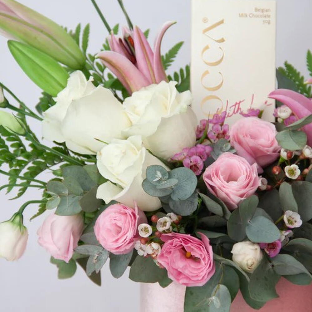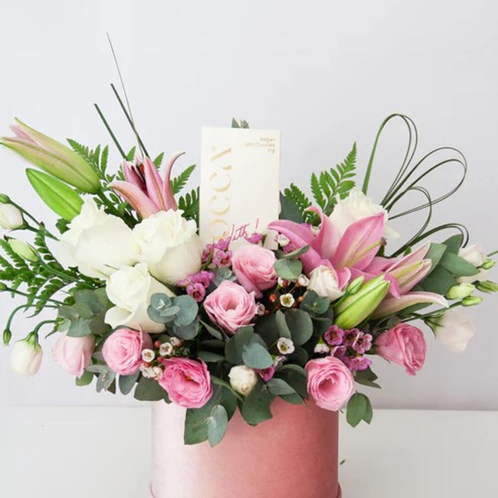 Surprise and delight with a gift thats tastes as good as it looks! Our Velvet Box Flower Arrangement is like a burst of joy in a plush velvet box. Packed with a playful mix of vibrant blooms, this arrangement also has a sweet surprise waiting inside! A decadent 50g chocolate bar, perfect for one , making it an ideal gift for birthdays, just-because days, or any occasion that calls for a little extra fun.