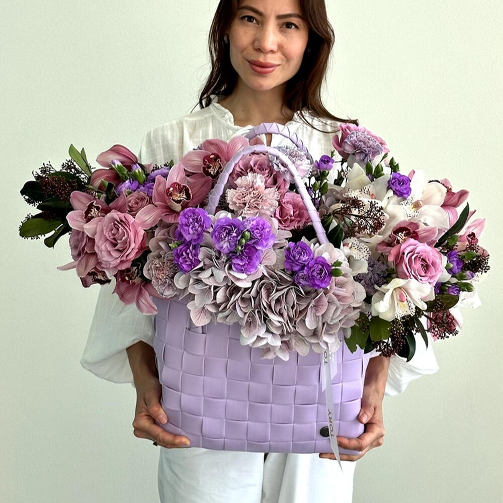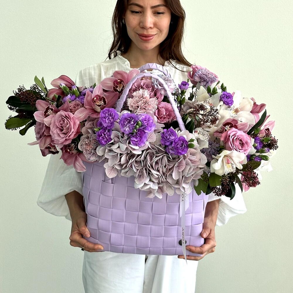 Composition: Hydrangea - 4, Skimmia - 4, Dianthus spray - 6, rose lilac - 6, Cymbidium - 15, Dianthus Space Dyed - 10, oasis - 1, bag - 1 Sizes: WIDTH - 60CM; HEIGHT - 60CM; LENGTH - 60CM; (including packaging) Size: 60 x 60 x 60 cm