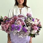 Composition: Hydrangea - 4, Skimmia - 4, Dianthus spray - 6, rose lilac - 6, Cymbidium - 15, Dianthus Space Dyed - 10, oasis - 1, bag - 1 Sizes: WIDTH - 60CM; HEIGHT - 60CM; LENGTH - 60CM; (including packaging) Размер: 60 x 60 x 60 см