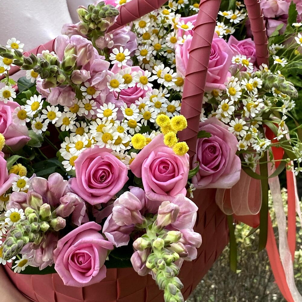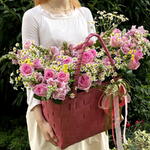 Composition: Shopper bag red Paris - 1, pink rose - 21, Tanacetum (chamomile) - 10, Mattiola - 15 Sizes: WIDTH - 65CM; HEIGHT - 45CM; LENGTH - 45CM; (including packaging) Size: 65 x 45 x 45 cm