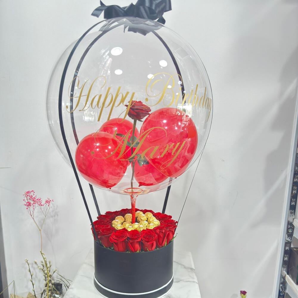 Red rose - 16 pcs ferero rocher - 16 pcs customised clear balloon - 1 pcs