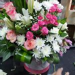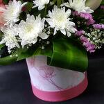 Limonium - 3 pcs Pink rose - 8 pcs chrysanthemum single - 10 pcs lily white - 1 pcs dark pink rose - 7 pcs gips - 3 pcs white rose 60 cm - 4 pcs