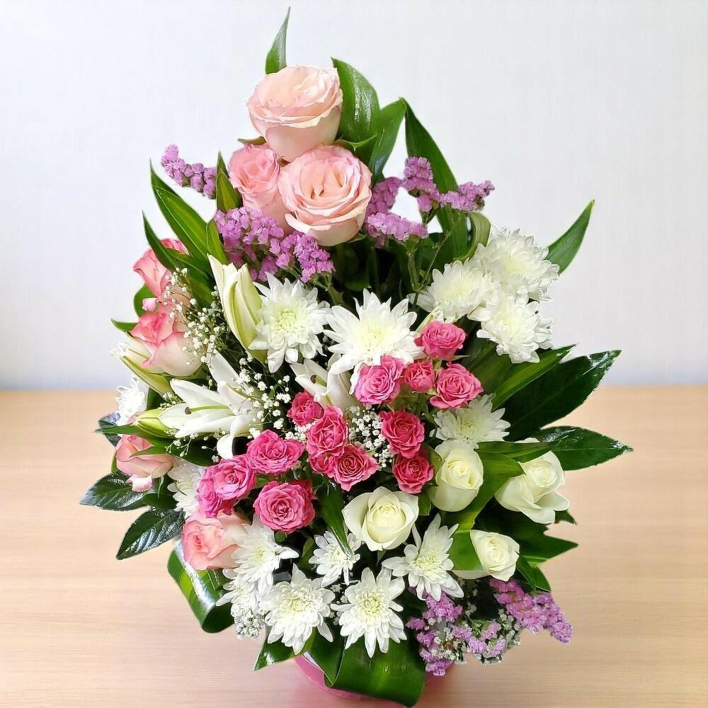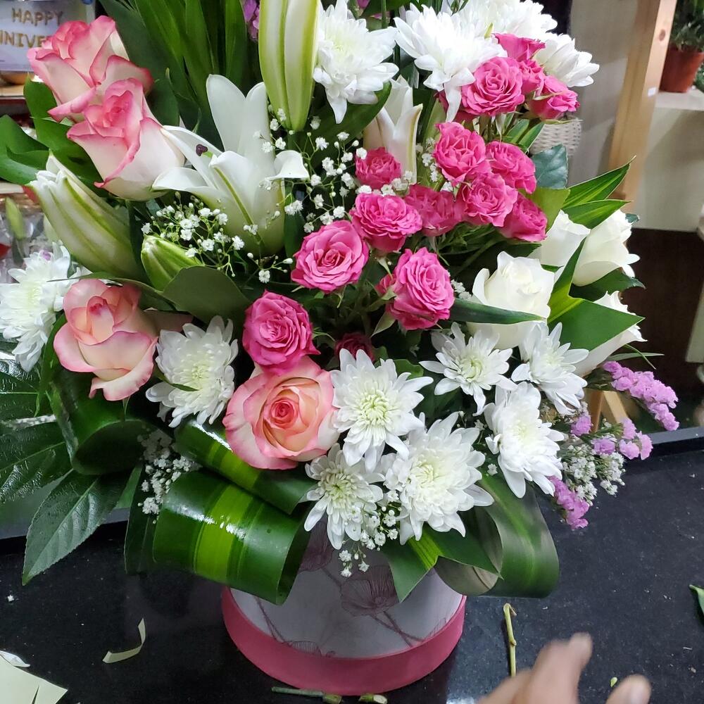 Limonium - 3 pcs Pink rose - 8 pcs chrysanthemum single - 10 pcs lily white - 1 pcs dark pink rose - 7 pcs gips - 3 pcs white rose 60 cm - 4 pcs