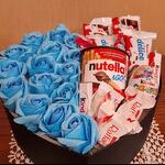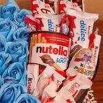 12 rose (red or pinkwhiteseasonal) 1 nutella go + 2 kinder cake + 4 rafaello + 1 kinder joy + 6 kinder choki bones+ 2 kinder bueno - 31 pcs