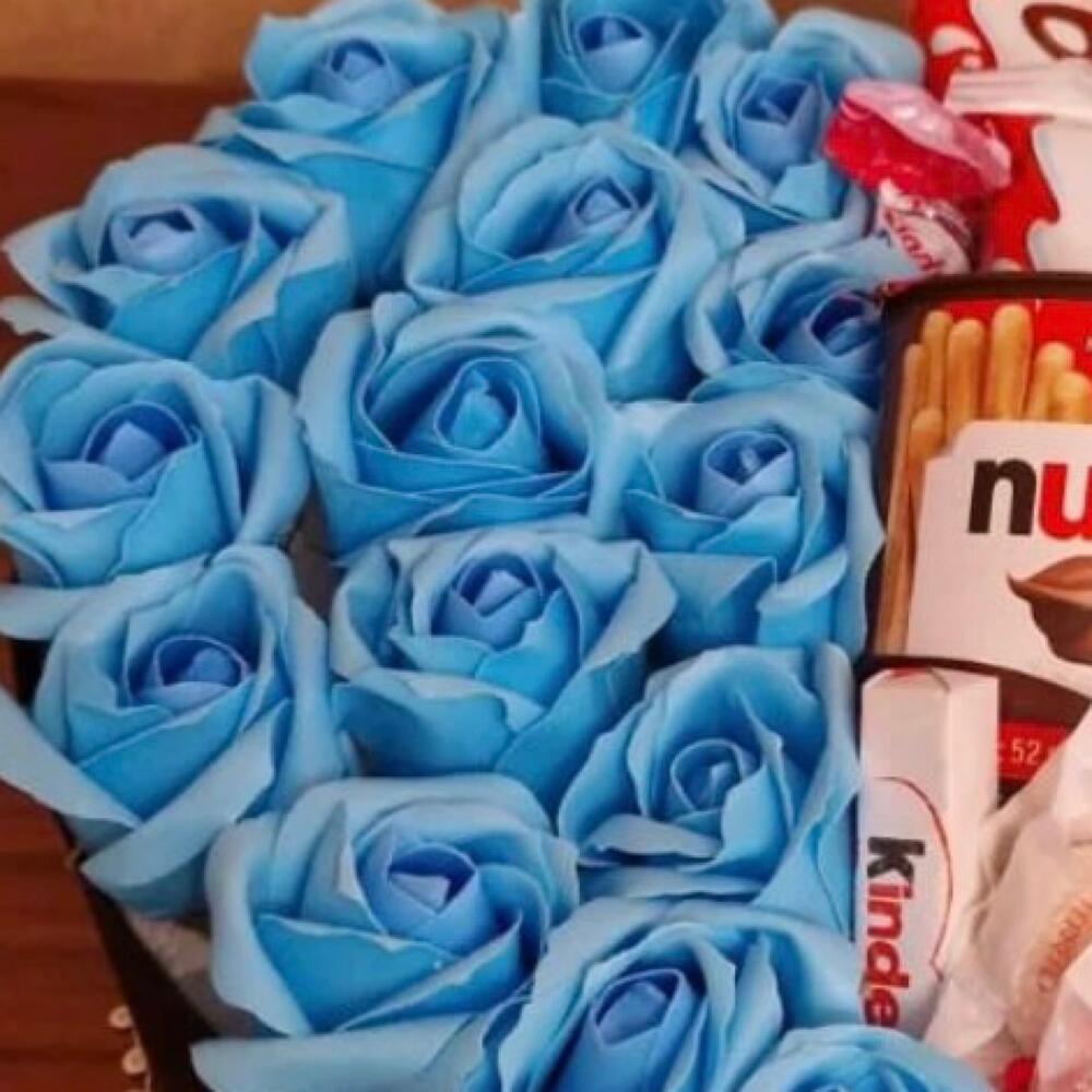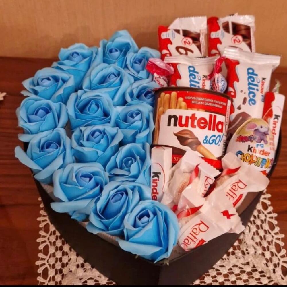12 rose (red or pinkwhiteseasonal) 1 nutella go + 2 kinder cake + 4 rafaello + 1 kinder joy + 6 kinder choki bones+ 2 kinder bueno - 31 pcs