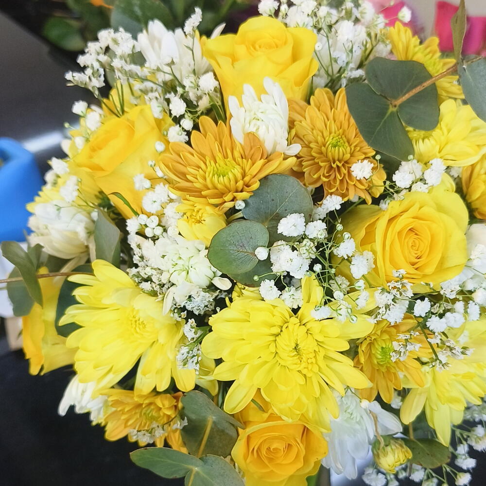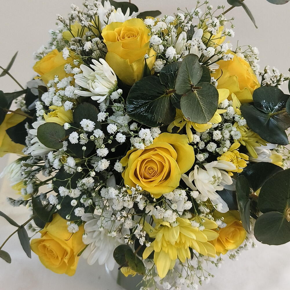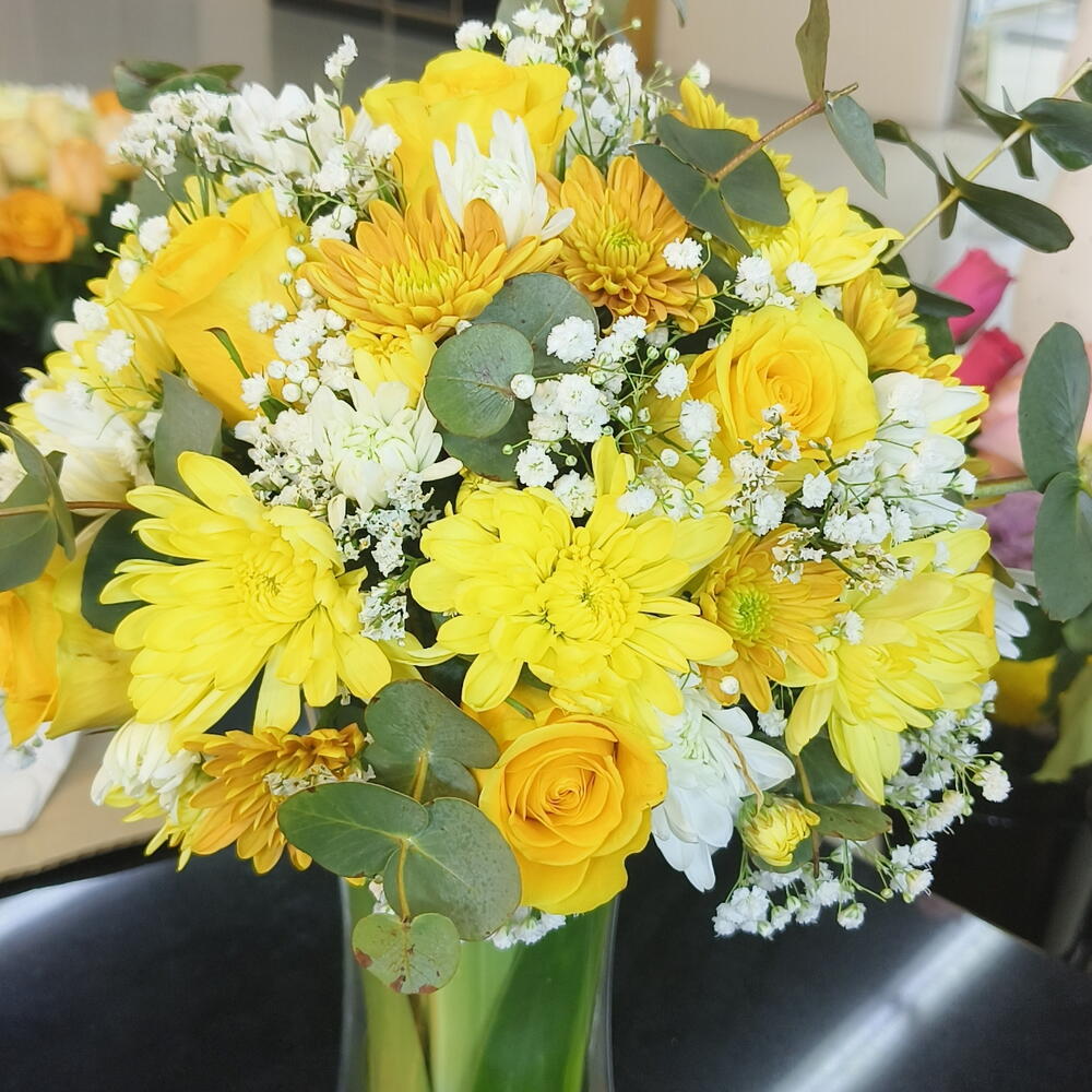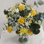 Yellow rose - 10 pcs glass vase - 1 pcs white chysanthemum - 1 pcs yellow chysanthemum - 3 pcs limonium white - 2 pcs