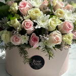 Box - 1 pcs Pink rose - 20 pcs White rose - 20 pcs Chrysanthemum white - 5 pcs