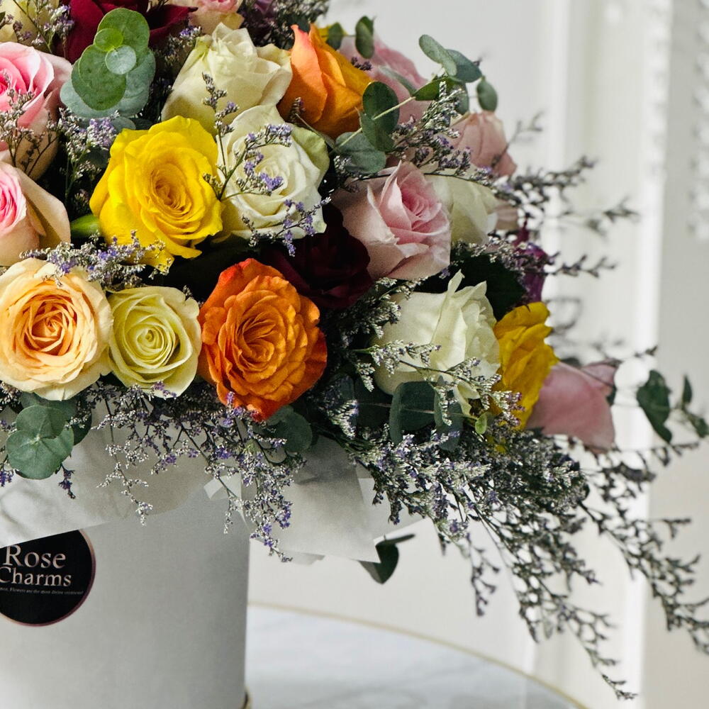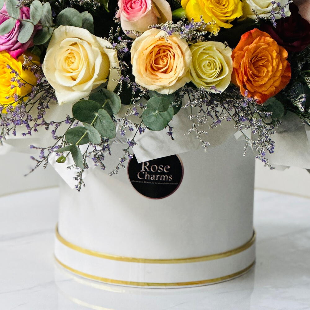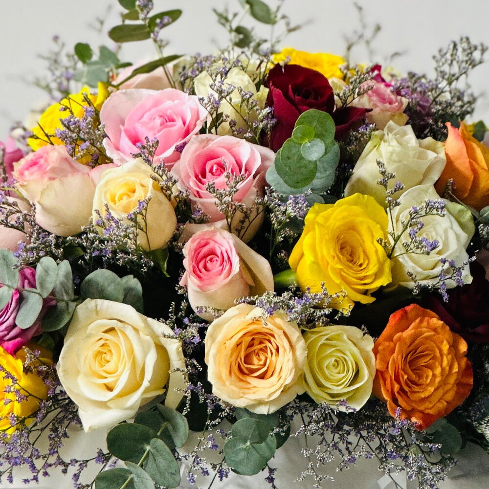 A couture box of 41 assorted roses—a vivid play of colors and textures, hand-set for instant wow. Experience nature’s palette, curated. Our mix rose box features 41 premium roses in complementary hues, arranged petal-tight in a luxury keepsake box. The result is a captivating display of color and texture—elegant, joyful, and photo-ready for birthdays, milestones, corporate gifting, or any moment that deserves pure delight. 41 × Assorted Roses (tone-matched heads; color mix may vary) Luxury box with hydration foam discreet greens Satin ribbon care card Approx. Size: 30–38 cm (W) × 28–34 cm (D) × 18–22 cm (H) Palette: Designer mix (blush, peach, pinks, reds, sunny yellows, creams—subject to availability) Care Tips: Keep cool, away from direct sun/AC. Add a little water to the foam at one corner daily. Remove spent blooms promptly. Turn the day vibrant—order now