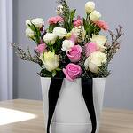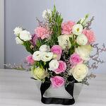 Pink rose - 7 pcs White rose - 4 pcs carnation - 4 pcs lemonioum - 10 pcs lisanthius - 5 pcs white bag - 1 pcs