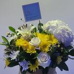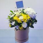 White rose - 3 pcs Yellow rose - 3 pcs spray chrysanthemum white - 3 pcs ruscus leaves - 5 pcs decorative box - 1 pcs white premium hydrangea - 1 pcs lillium white - 1 pcs spray chrysanthemum yellow - 3 pcs