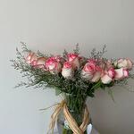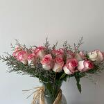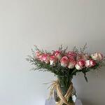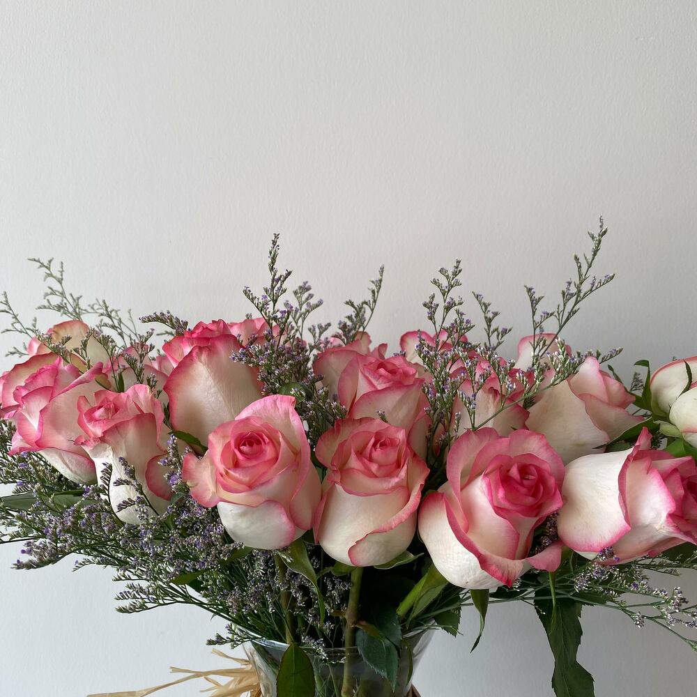glass vase - 1 pcs limonium purple - 3 pcs roses pink - 20 pcs