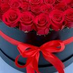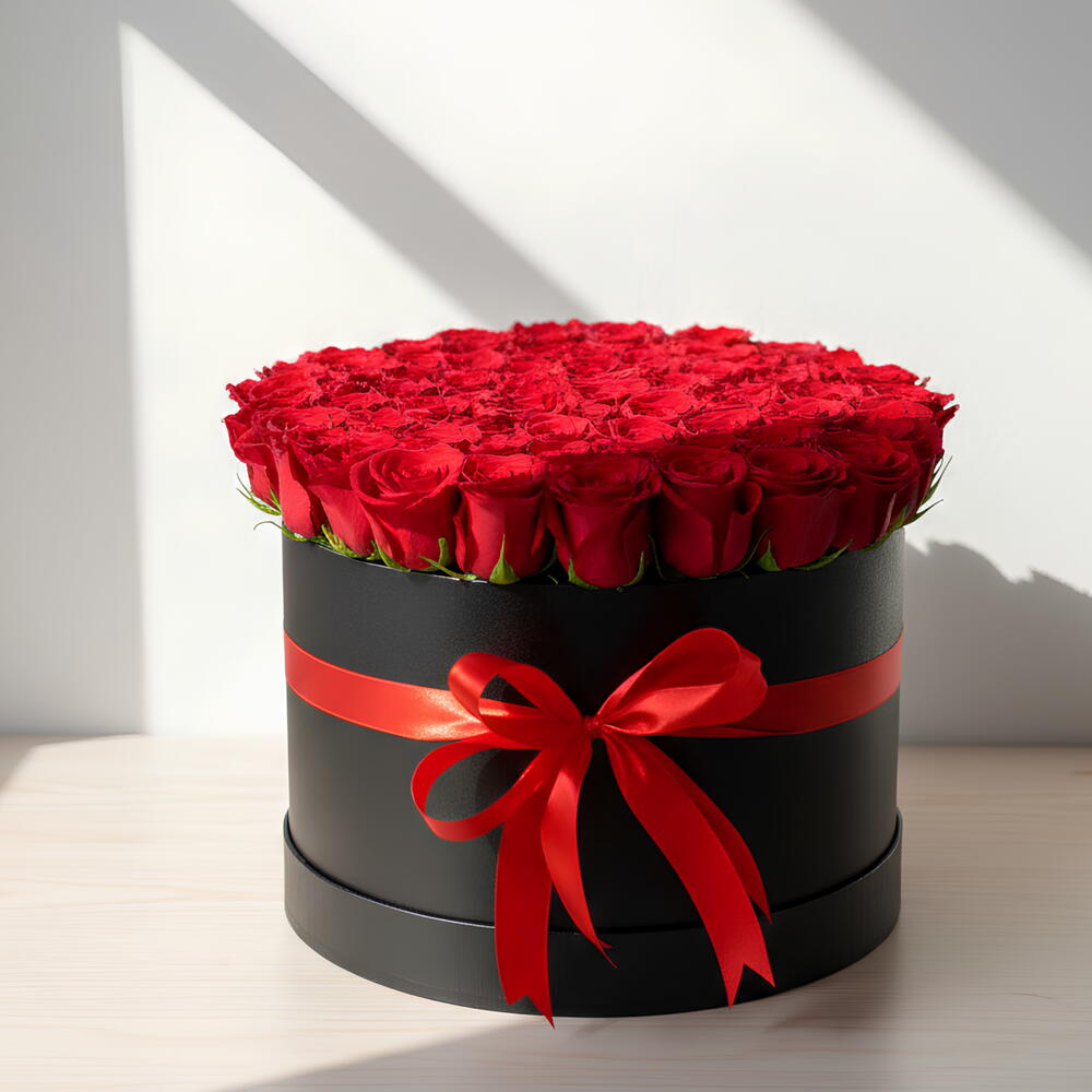 The deep crimson blooms symbolize passion, love, and devotion, while the sophisticated black box and bold red satin ribbon create a striking, high-end presentation. This arrangement is ideal for romantic milestones, anniversaries, proposals, or grand gestures that deserve unforgettable elegance.