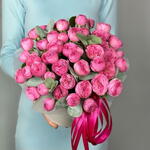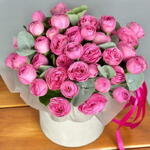 round box with Sylva Pink peony shrub roses and eucalyptus. A stylish hat arrangement to put you in the perfect mood. Perfect as a sign of attention, the recognition of fond feelings, as well as a birthday gift for a girl, girlfriend, mother, grandmother, sister. We recommend adding a little water at the base of the flowers every day to keep the oasis moist.