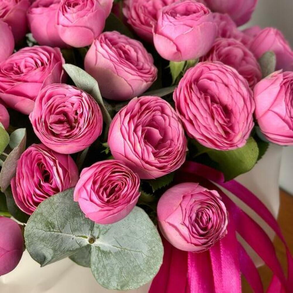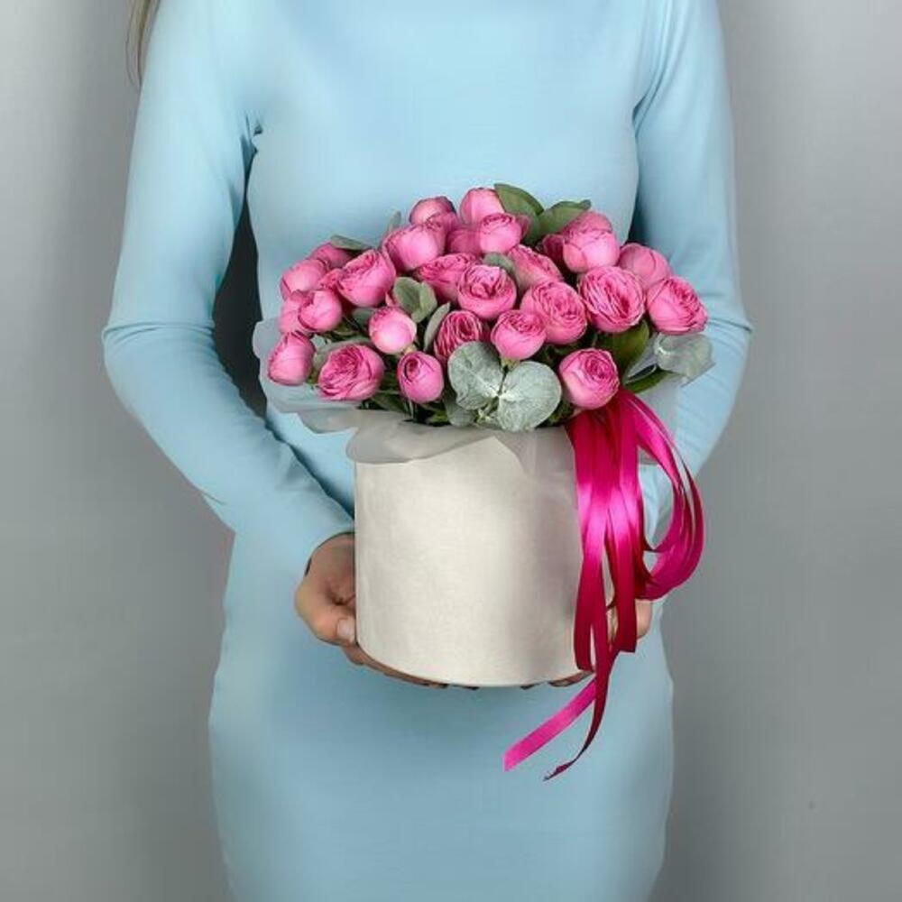 round box with Sylva Pink peony shrub roses and eucalyptus. A stylish hat arrangement to put you in the perfect mood. Perfect as a sign of attention, the recognition of fond feelings, as well as a birthday gift for a girl, girlfriend, mother, grandmother, sister. We recommend adding a little water at the base of the flowers every day to keep the oasis moist.