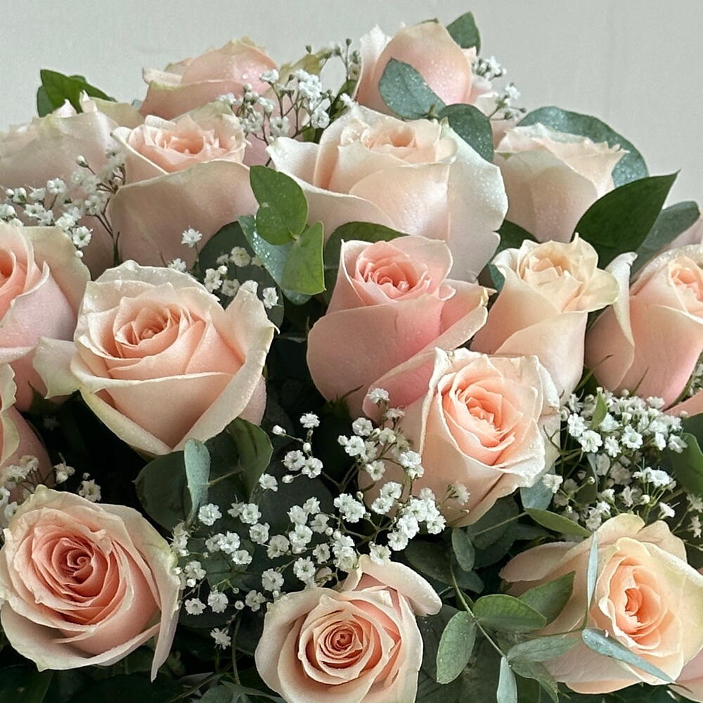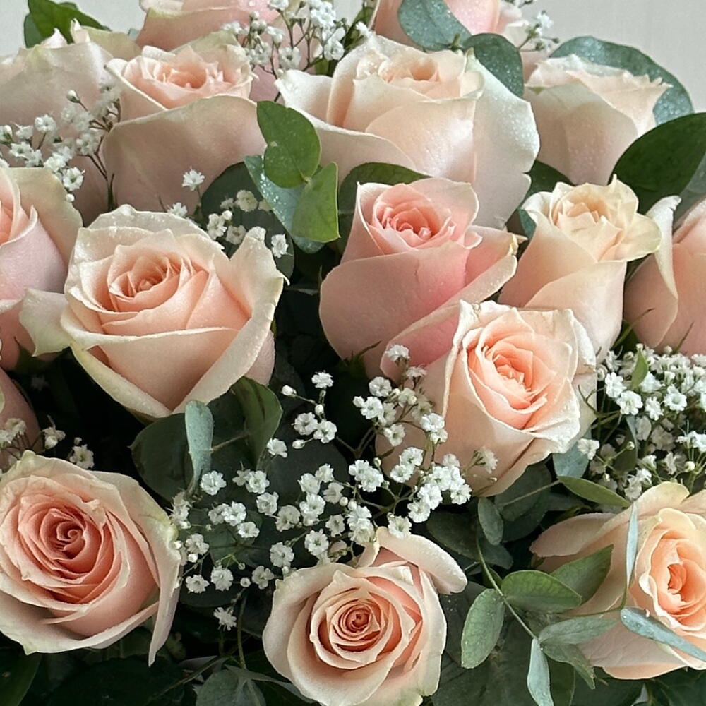 Indulge in a vision of soft elegance with our enchanting arrangement featuring 51 delicate pink roses accompanied by 5 sprigs of gypsophila, all nestled within a stylish box.