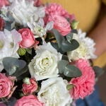 Discover the enchanting elegance of our bouquet, a delightful blend of pink roses, white chrysanthemums, pink dianthus, and white eustomas. This exquisite arrangement beautifully balances the soft, romantic hues of pink with the pure, pristine shades of white, creating a harmonious and sophisticated display. Perfect for any occasion, this bouquet brings a touch of grace and charm to your home or makes a thoughtful gift for someone special.