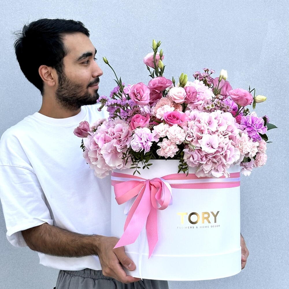 Composition: Hydrangea - 8, pink rose - 16, Chamelacium - 10, Dianthus Space Dyed - 10, Dianthus - 5, Spray Rose Julieta peach - 5, Ruscus - 1, Dianthus spray - 6, Pistacia - 5, Statica - 7, box - 1 Sizes: WIDTH - 40CM; HEIGHT - 40CM; LENGTH - 40CM; (including packaging) Size: 40 x 40 x 40 cm