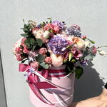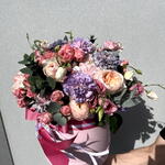 Composition: Spray Rose Odilia light pink - 5, Dianthus - 10, Lisianthus - 7, Eucalyptus - 2, Rose David Austin - 7, Hydrangea - 2, box - 1 Sizes: WIDTH - 30CM; HEIGHT - 30CM; LENGTH - 30CM; (including packaging) Size: 30 x 30 x 30 cm