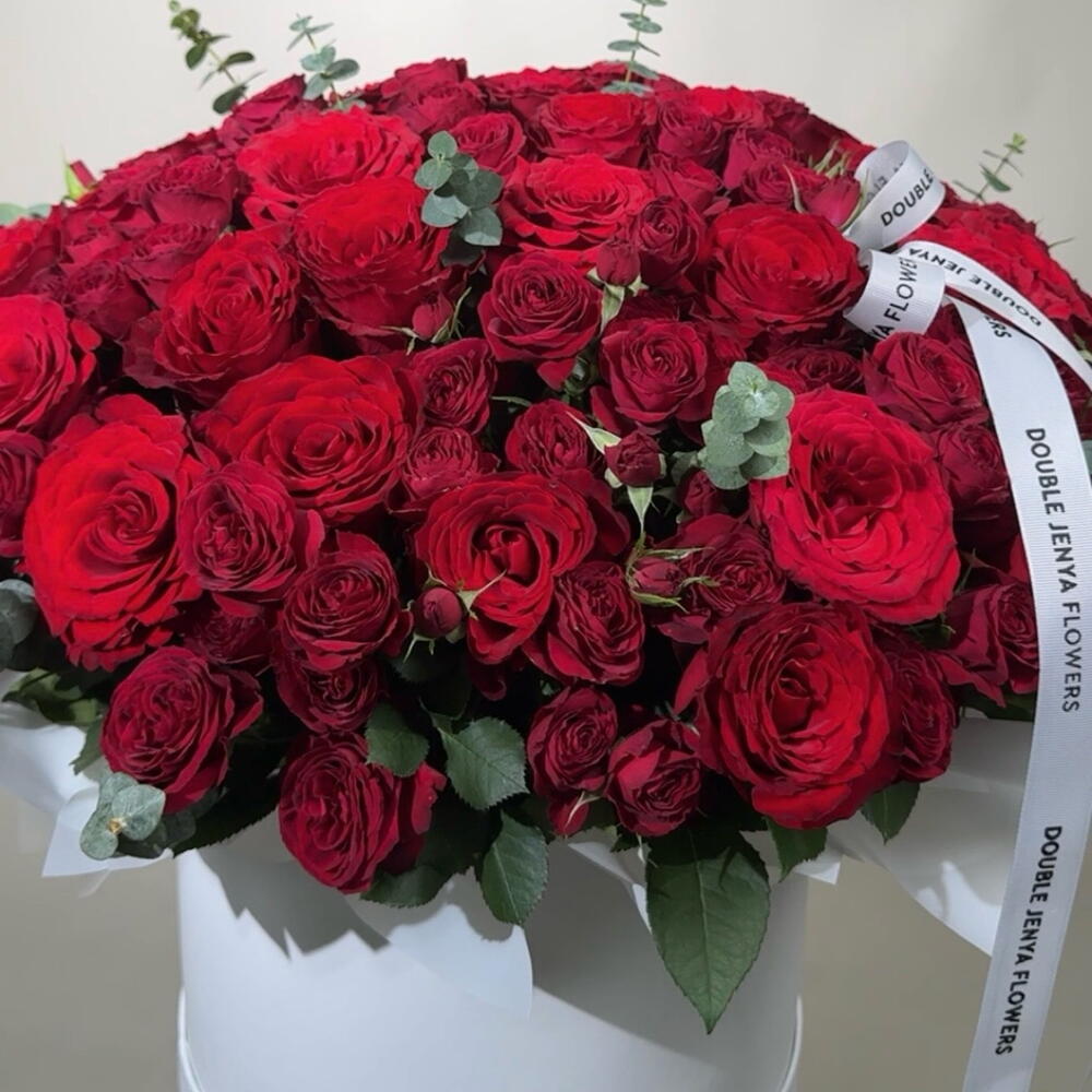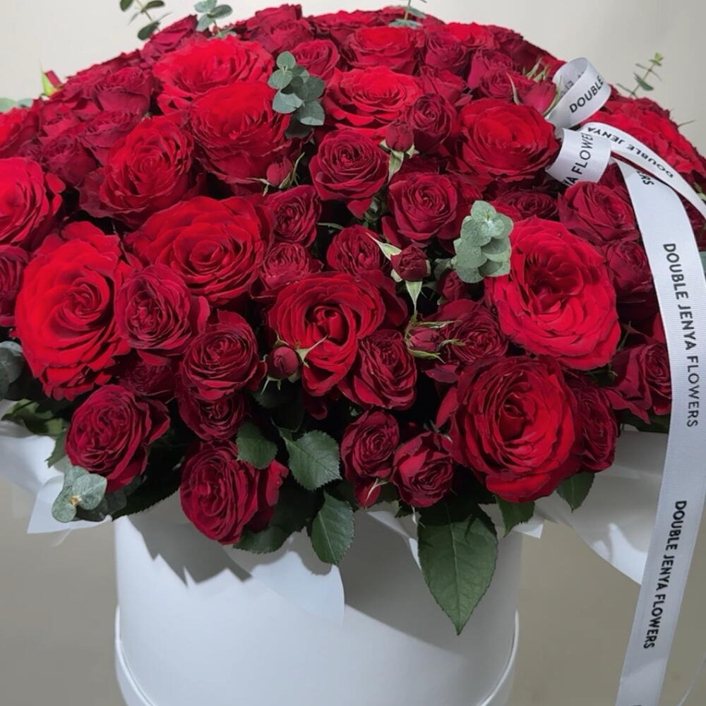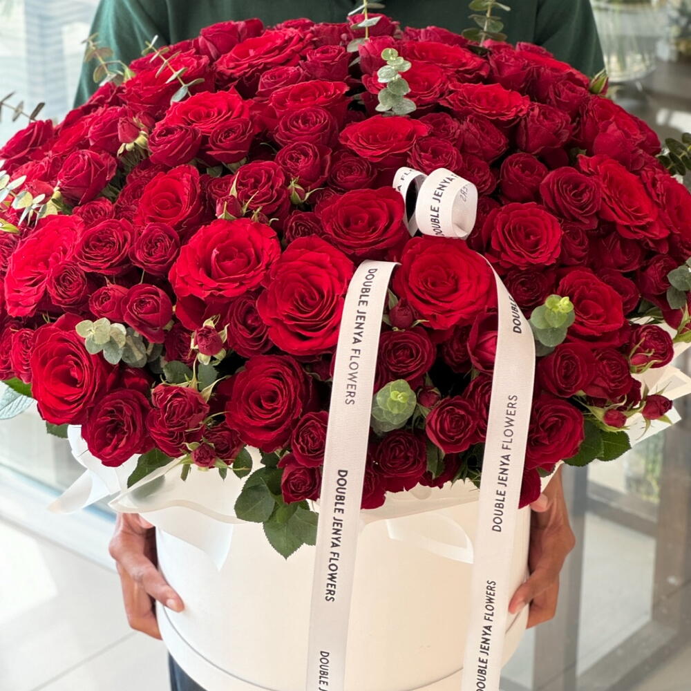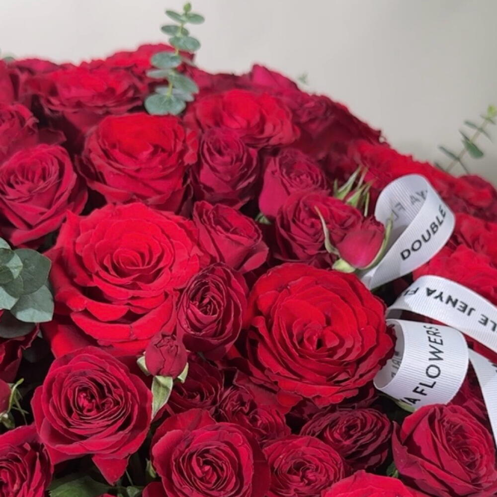 Exude an aura of romance and elegance with our Flowers in a Box. Composed of a lavish arrangement of 70 stunning single red roses, delicately paired with 30 accents of spray red roses. Each box is thoughtfully curated with 10 pieces of Eucalyptus to enhance its grandeur flawlessly. This spectacular floral arrangement will surely sweep your loved ones off their feet. True love, passion, and beauty are flawlessly captured in this bespoke composition. The beauty of our flowers in a box is beyond measure, an elegant and timeless way to express your adoration and affection.