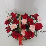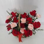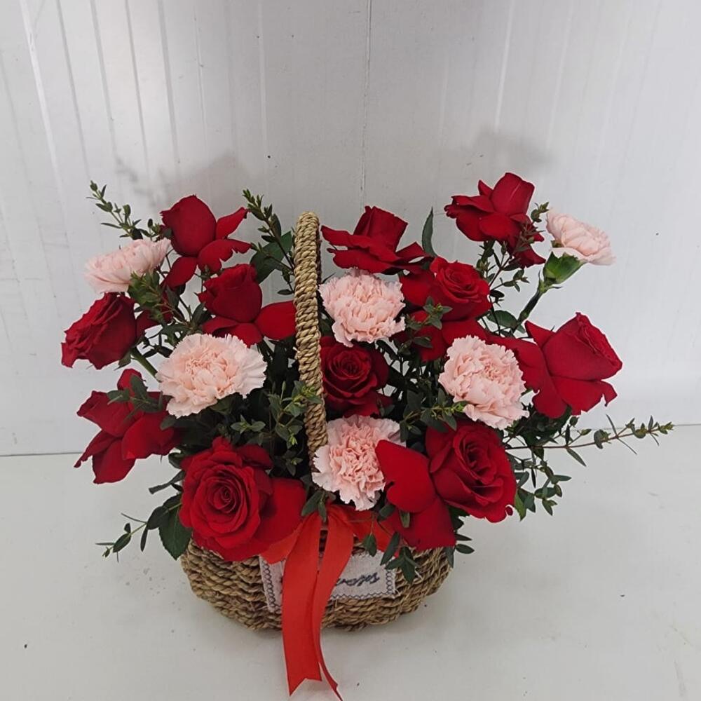 Red roses and carnations with greenery in a flower basket