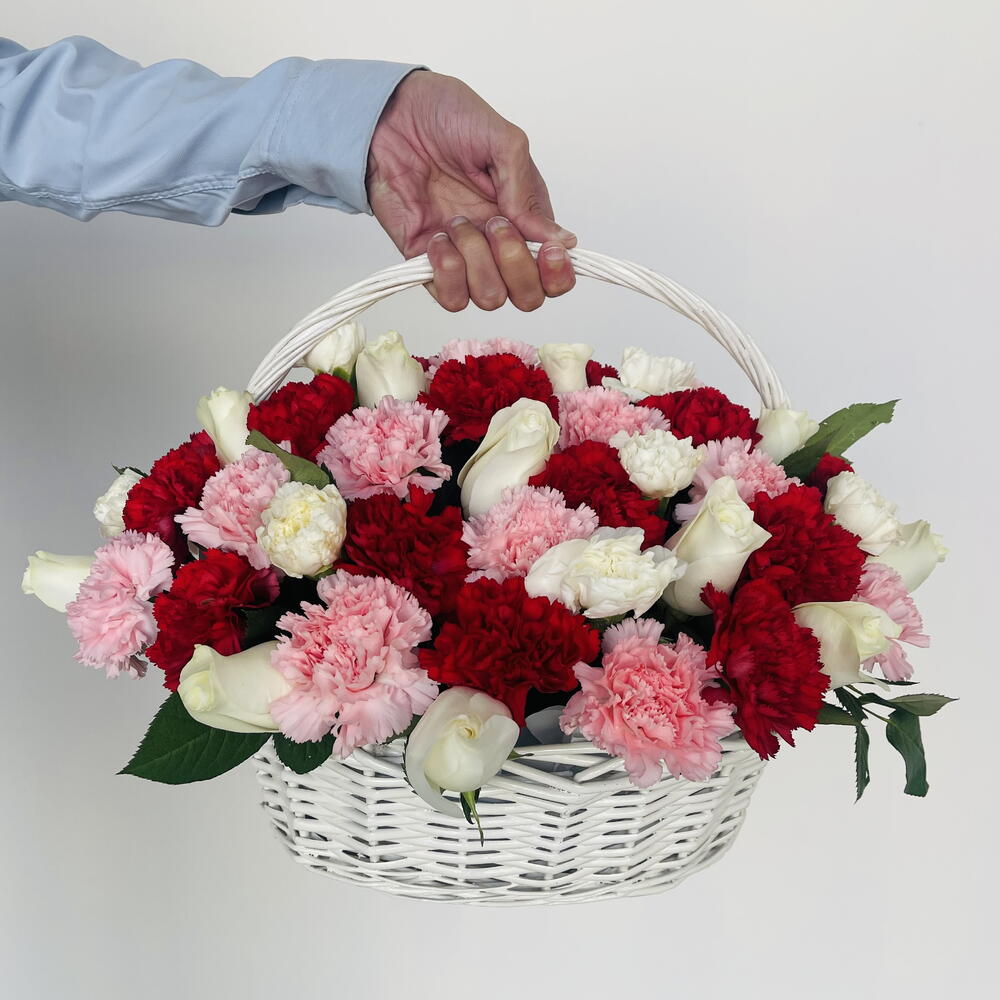Celebrate the beauty and joy of life with this exquisite flower arrangement. It features gracefully arranged 20 Red Carnations, 20 Pink Carnations, and 20 White Roses in a delightful dance of color and fragrance. These are handsomely nestled in a medium white basket that accentuates their natural beauty. Perfect for any occasion or no occasion at all, this lush ensemble of flowers in a basket is as beautiful as it is heartwarming. Create memorable moments with this floral marvel that is a feast for the eyes and a treat for the senses.