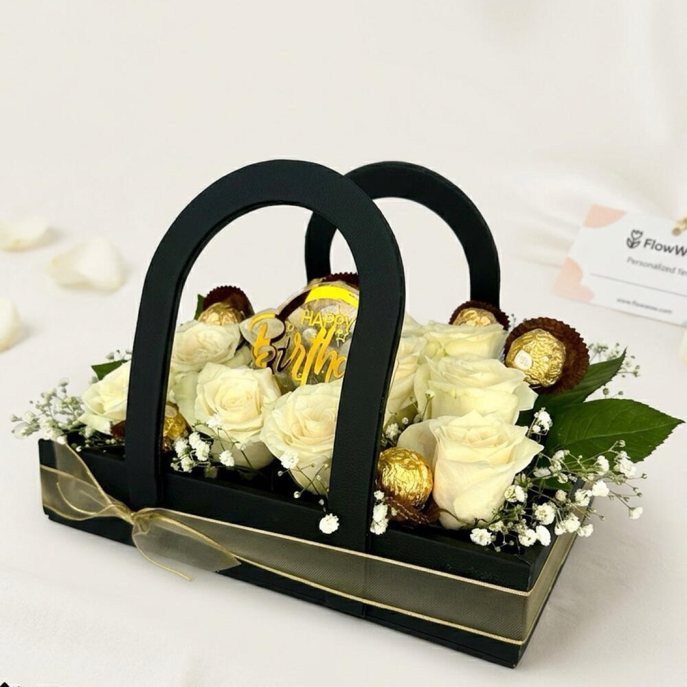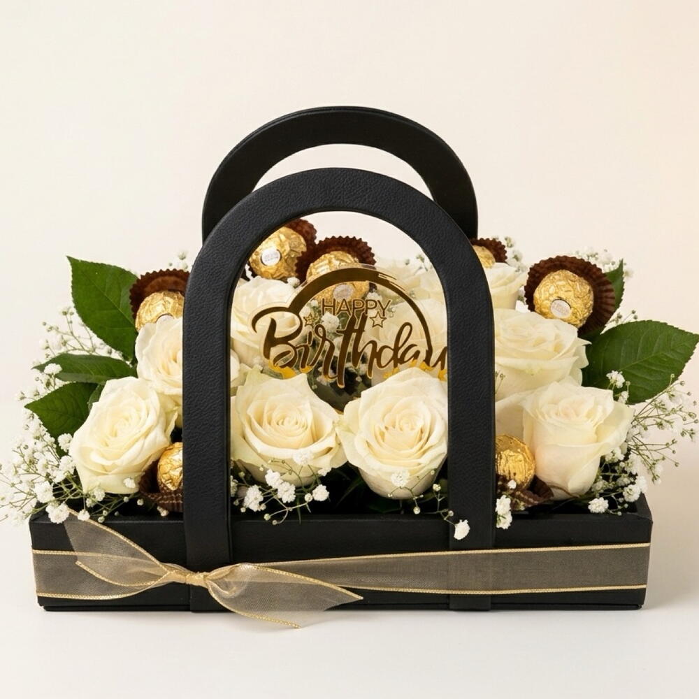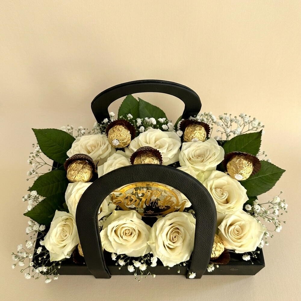 luxury leather bag filled with fresh, premium roses ferrero rocher chocolates. features a "happy birthday" charm. the perfect 3-in-1 gift for her / his special day!