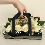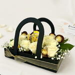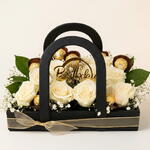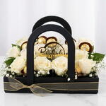 greeting card - 1 pcs ferrero rocher chocolates - 9 pcs white roses and gypsophila - 12 pcs leather bag with golden ribbon - 1 pcs acrylic birthday tag - 1 pcs