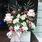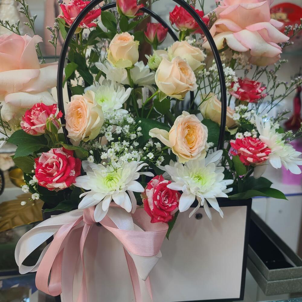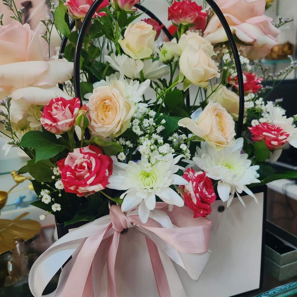 Immerse yourself in the charm and grace of this beautiful Flowers in a Basket arrangement. The bouquet showcases two elegant pink roses and two delicate baby pink roses, paired with two stunning double color baby roses that add a whimsical touch. Nestled in this floral celebration is a single white chrysanthemum, symbolizing purity and innocence, accompanied by two glossy Ruscus leaves. The addition of a single stem of gipsofila adds a fairy-like charm to this lush arrangement. The flowers are elegantly presented in a stylish paper bag, delicately tied with a satin ribbon bow, making it an ideal gift or a delightful addition to your home decor. Experience the effortless elegance of nature with this exquisite floral basket.