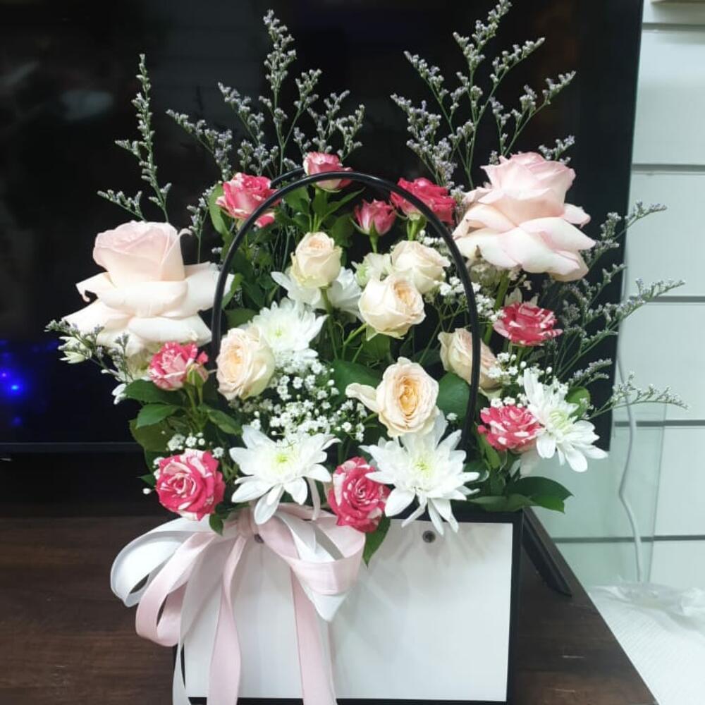 Ruscus - 2 pcs Pink rose - 2 pcs Chrysanthemum white - 1 pcs baby pink rose - 2 pcs paper bag - 1 pcs ribbon satin bow - 1 pcs gipsofila stem - 1 pcs double color baby rose - 2 pcs