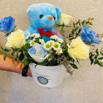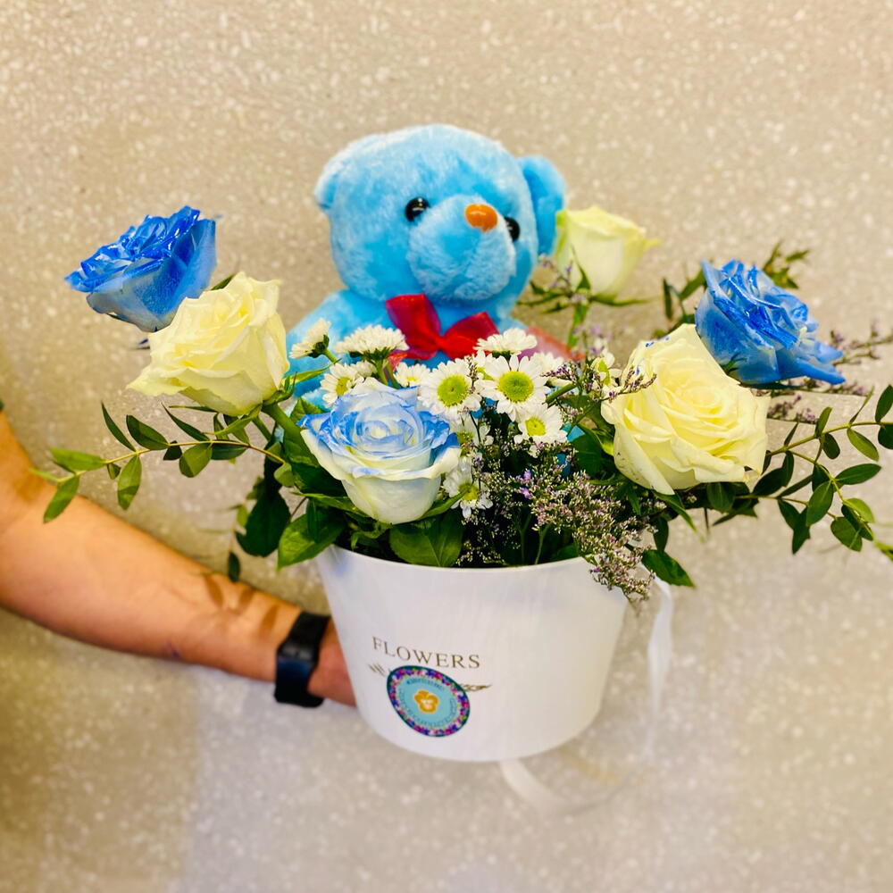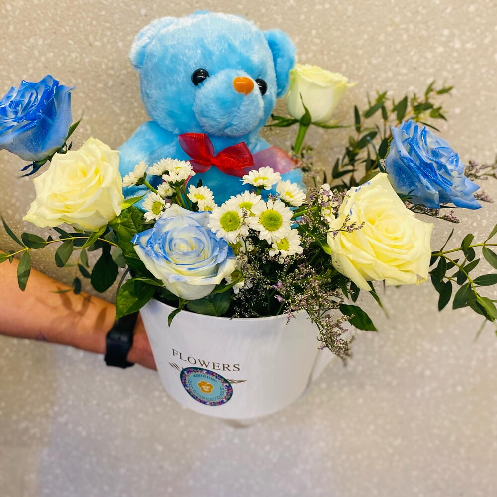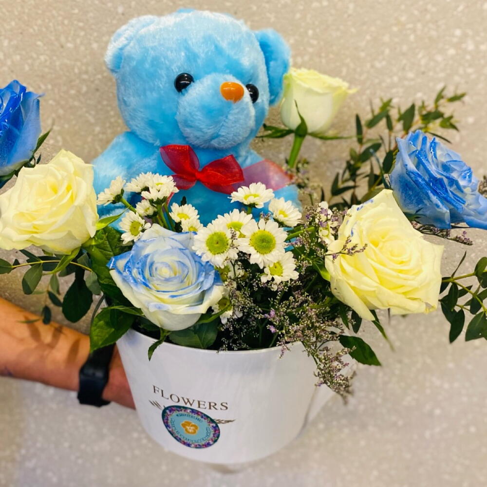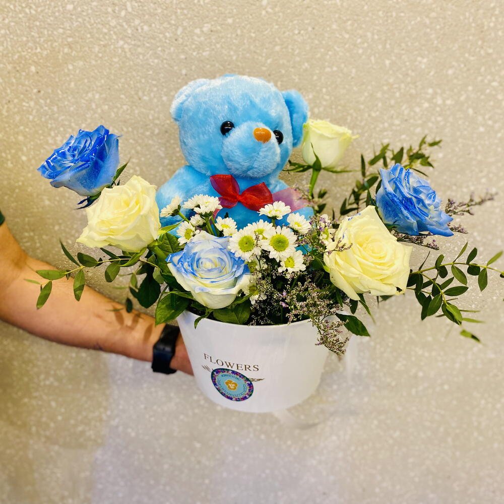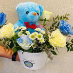 A heartwarming floral basket featuring 3 white roses, 3 blue-sprayed roses, 2 stems of white Euro spray chrysanthemums, and soft floral fillers—complete with a cuddly 12-inch blue teddy bear. Size: Width 40 cm × Height 50 cm — a perfect gift to welcome a precious baby boy.
