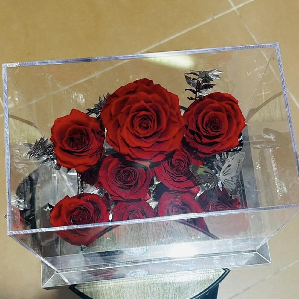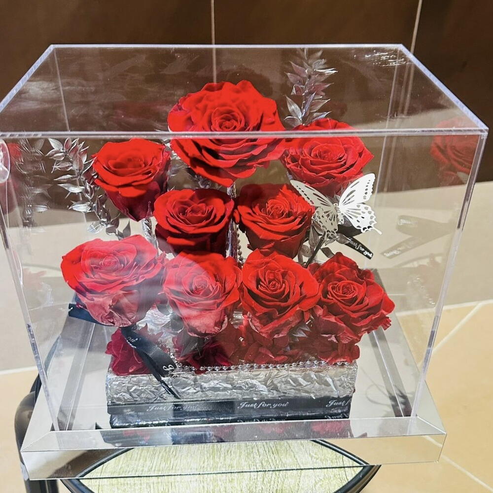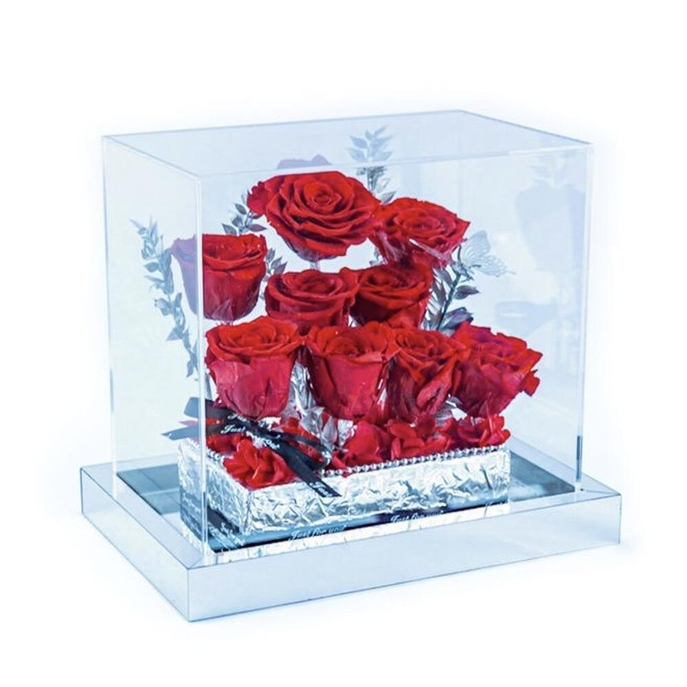 for ever rose - 1 pcs high quality glass dome - 1 pcs preserved red roses - 9 pcs preserved ruscus stems - 6 pcs