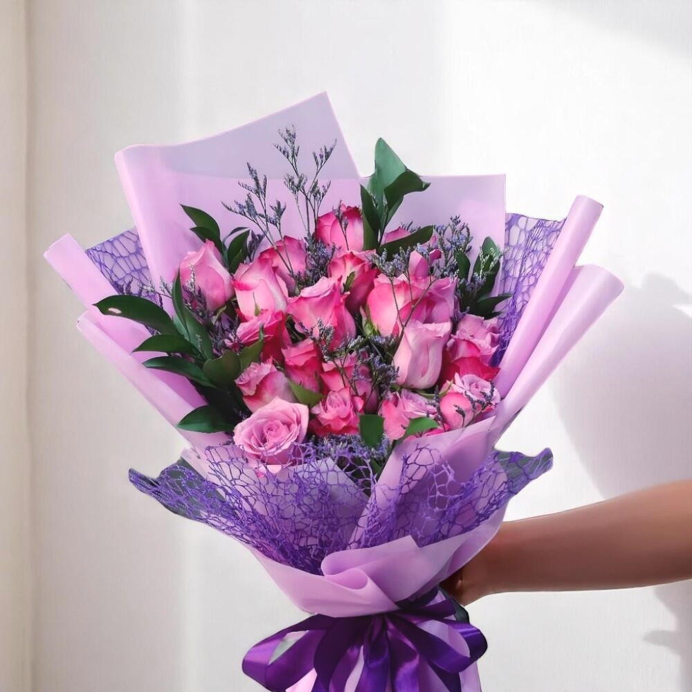 Striking and feminine, this luxurious bouquet of vibrant purple roses, delicate limonium, and lush greenery is a true eye-catcher. Wrapped in soft lilac film and finished with an elegant purple mesh and satin bow, this bouquet perfectly balances romance and modern style. Whether for a birthday, anniversary, or a spontaneous gesture of love, it’s sure to make a lasting impression. To keep the bouquet looking its best, place it in clean, cool water and trim the stems diagonally every 2–3 days. Keep away from direct sunlight, heat, and cold drafts. Refresh the water regularly and remove any fading blooms to maintain its beauty and freshness.