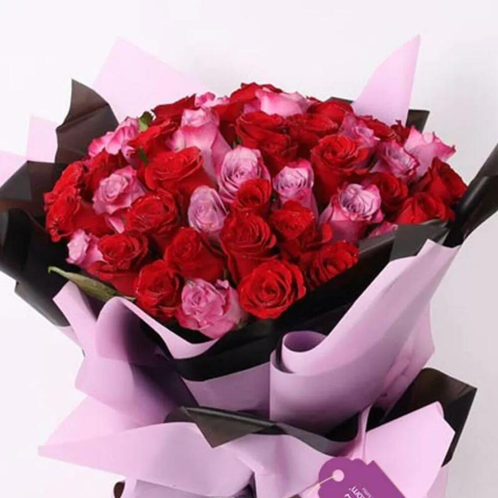 Red rose - 31 pcs purple rose - 20 pcs black ribbon bow - 1 pcs